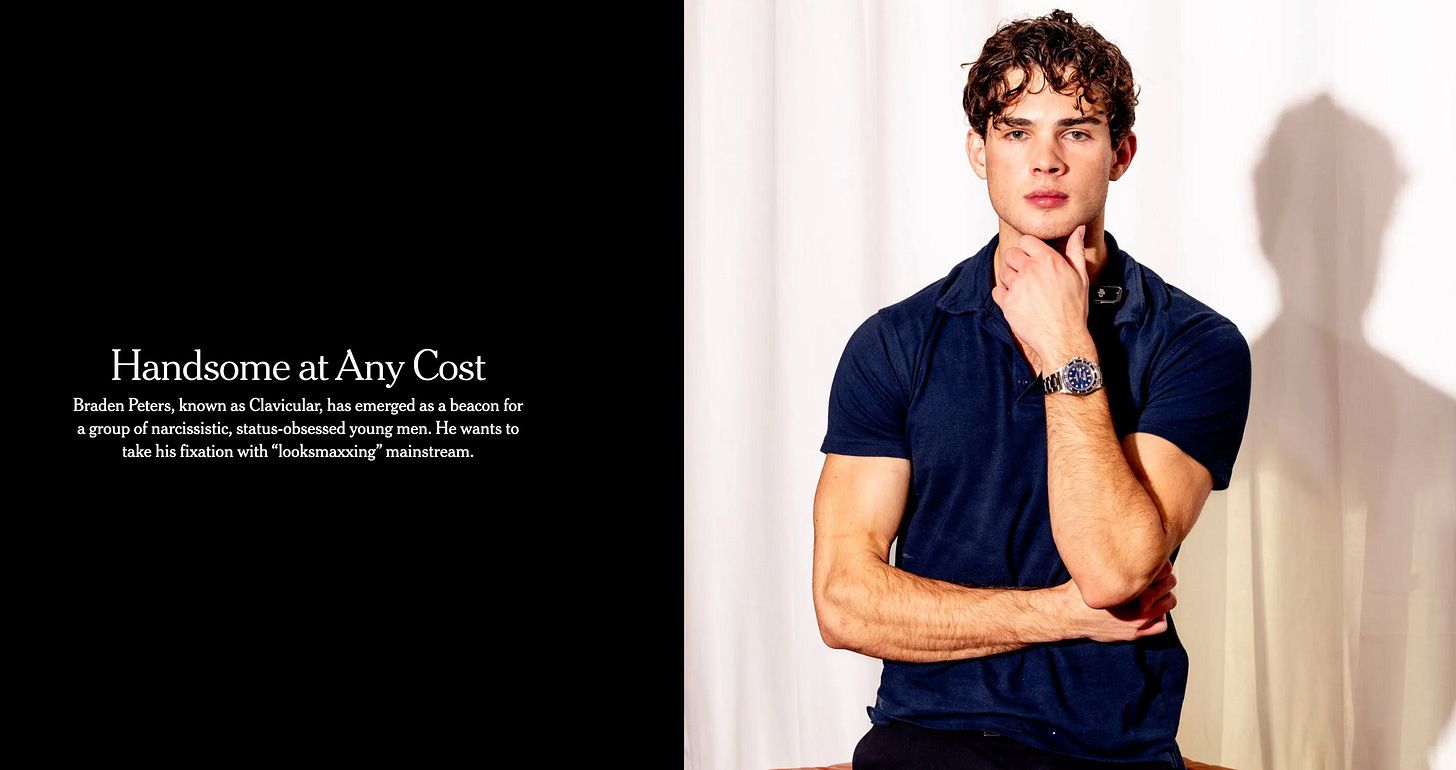 The biggest name in the space right now is Clavicular, a 20-year-old streamer profiled by the New York Times in February 2026. He makes over $100K a month, has 10K concurrent viewers, and started taking testosterone at 14. He ordered steroids to a PO box when his parents threw out his first stash. He smashed his own jaw to reshape it. He sees every attempt to be more attractive as a rational one. Even if it’s literally hitting himself in the face with a hammer.