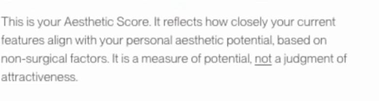 A score is a score. Calling it aesthetic potential instead of attractiveness doesn’t change what happens in your brain when you see 49 out of 100 next to your face. The disclaimer is corporate language trying to outrun a number.