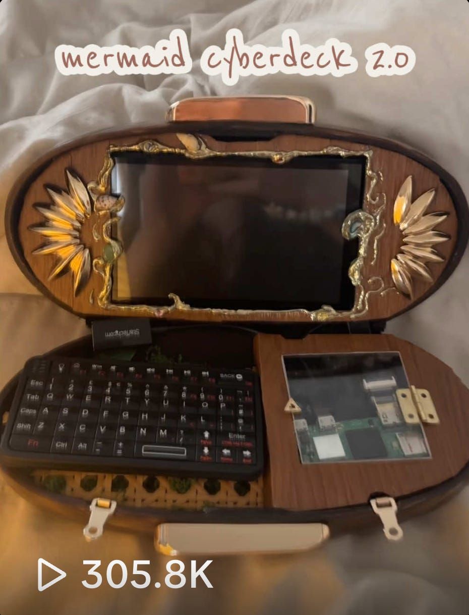 Get your kids off looksmaxxing on social media and get them a Rasberry Pi. I’ve been seeing very cool girls on TikTok build Cyberdecks, custom portable computers built with Raspberry Pi boards and 3D-printed cases. The builds typically feature dual screens and modular components, used for field work, hardware testing, and coding on the go. It’s definitely influenced me to get my hands on a Raspberry Pi to tinker with the next time I have a free weekend. (TikTok)