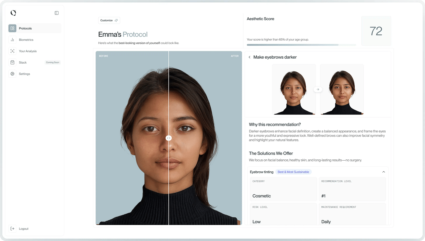 Qoves is a $150/year facial analysis service that uses AI and academic research to evaluate your face and build a personalized glow-up plan, without surgery. You upload photos, answer a few questions, and get back a detailed breakdown of your features, biometric scores, and a step-by-step protocol covering grooming, skincare, and styling. The pitch is improving overall facial harmony rather than fixating on one feature, with before-and-after simulations and progress tracking over time.