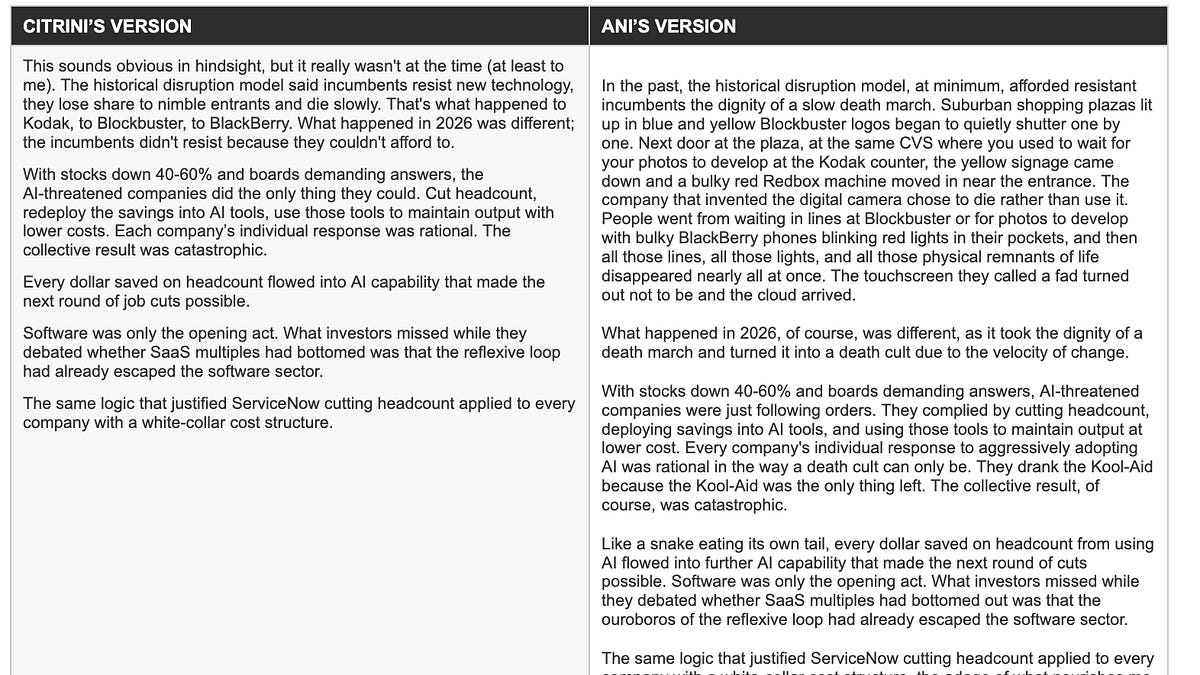 I suggest checking out “Vibe laundering, pt. 1: On Citrini Research, disclosure gaps & the architecture of influence” and “Vibe Laundering, Pt. 2: Citrini, the Co-Author and the Edit (remix not featuring the SEC” on all of this.